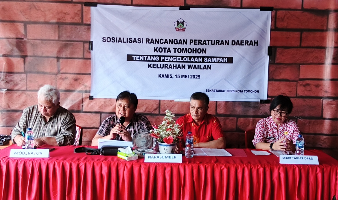 Anggota Dewan Perwakilan Rakyat Daerah (DPRD) Kota Tomohon, Franky Fendy Oroh, A.Md, menjadi narasumber dalam kegiatan Sosialisasi Rancangan Peraturan Daerah (Ranperda) tentang Pengelolaan Sampah yang digelar di Kelurahan Wailan, Kecamatan Tomohon Utara, pada Kamis, 15 Mei 2025.