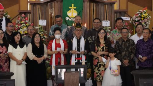 Walikota Tomohon Caroll JA Senduk SH bersama Ketua TP-PKK Kota Tomohon drg Jeand’arc Senduk-Karundeng dan Wakil Walikota Tomohon Sendy GA Rumajar SE MIKom, menghadiri Ibadah Pengucapan Syukur Kota Tomohon Tahun 2025, (24/8/2025) di GMIM Kakaskasen Pniel Tomohon Utara.
