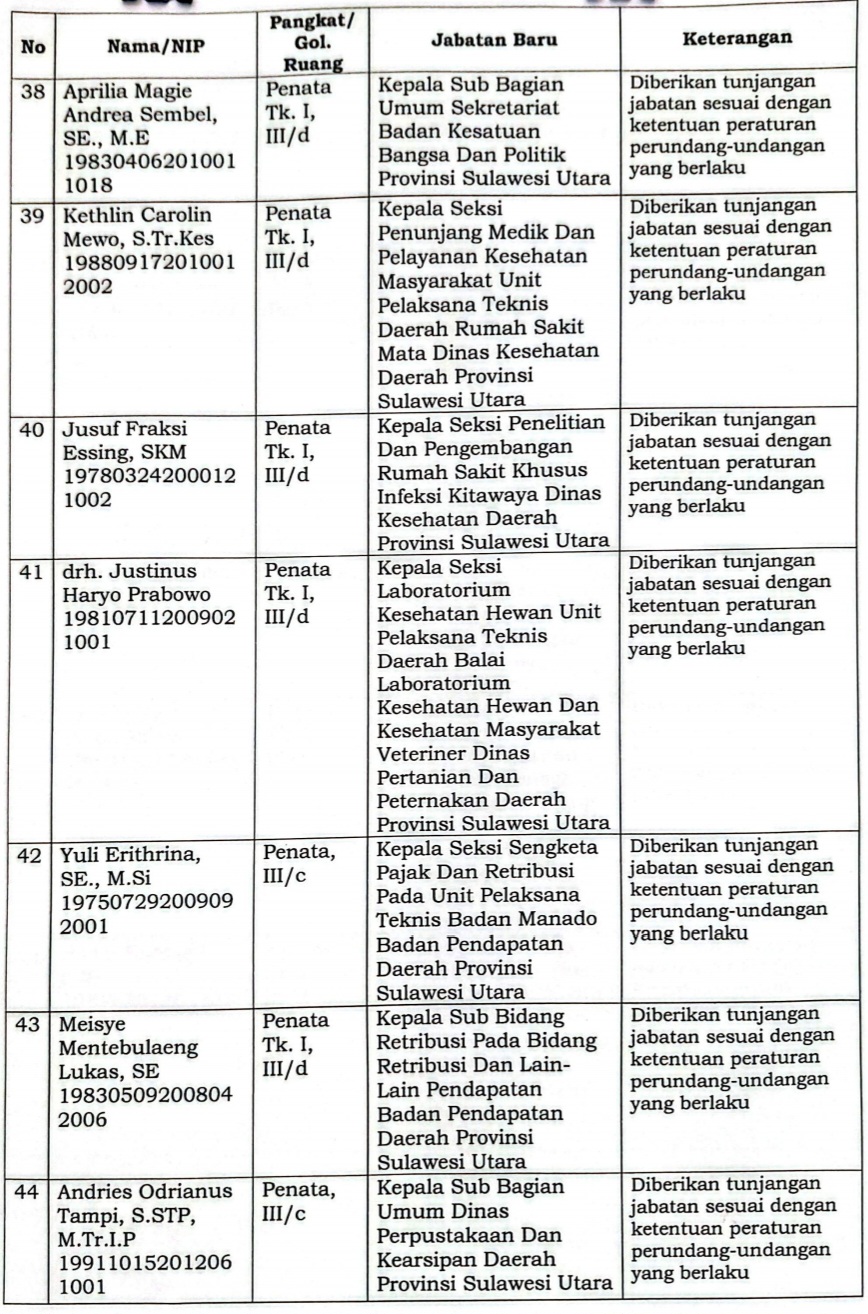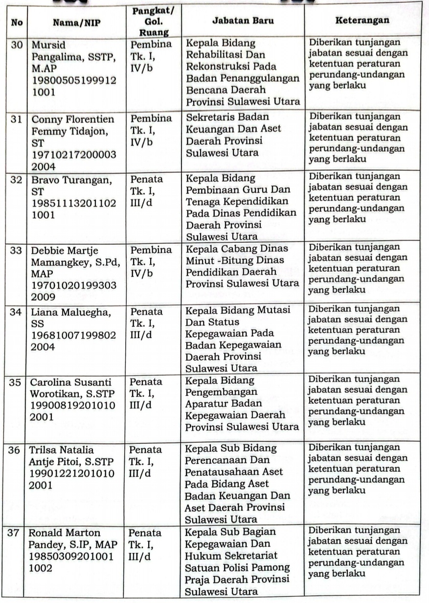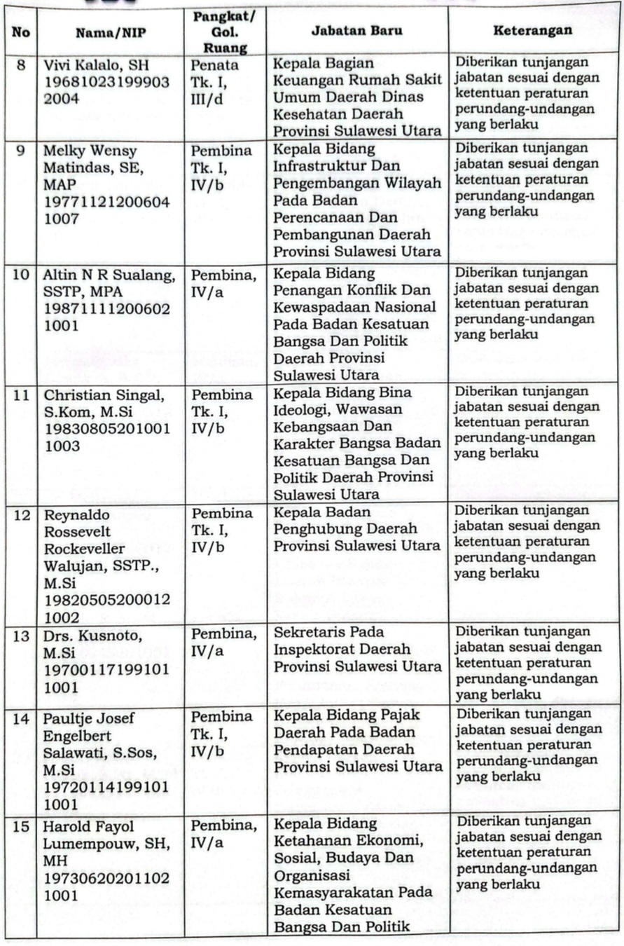 Sejumlah nama mencuat dalam daftar pengisian jabatan sebut saja, Jemmy Ringkuangan kini menjabat Assisten II yang sebelumnya Kepala Dinas Pemuda dan Olahraga Sulut. Sementara Steven Liow ditunjuk sebagai Staf Ahli Gubernur.