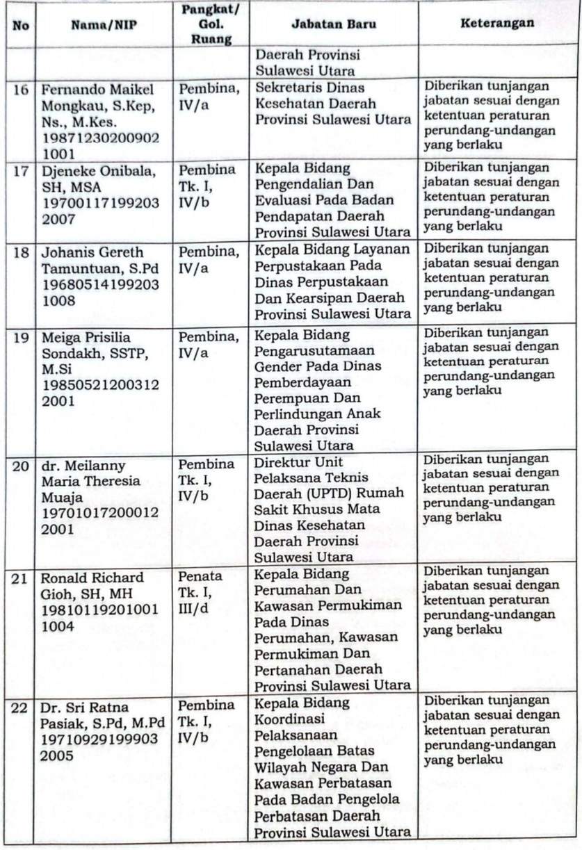 Selain itu, Susan Pangalila dan Roldy Mailangkay juga terlihat berdiri saat pemanggilan nama dalam prosesi pengisian jabatan.