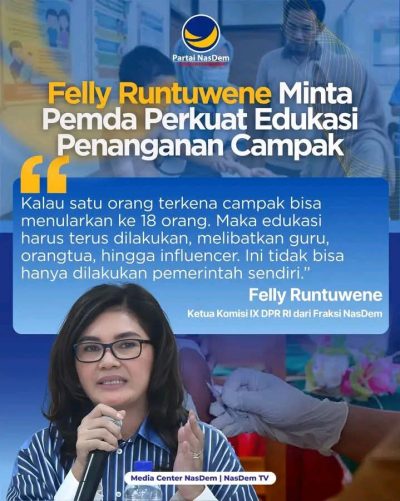 JAKARTA, ManadoTEMPO– Ketua Komisi IX DPR RI, Felly Estelita Runtuwene, SE, memberikan instruksi tegas kepada seluruh Pemerintah Daerah (Pemda) di Indonesia untuk segera memperkuat langkah edukasi terkait penanganan dan pencegahan penyakit campak.