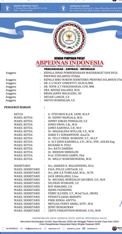 SULUT, ManadoTEMPO – Pasca menerima mandat resmi dari Dewan Pimpinan Pusat (DPP) ABPEDNAS melalui Ketua Umum ABPEDNAS Indonesia Ir. H. Indra Utama, M.PWK, IPU dan Prof. Dr. Reda Manthovani, S.H., LL.M.. Ketua Dewan Pengawas, Jaksa Agung Muda Intel. langkah nyata mulai dipersiapkan untuk memperkuat tata kelola desa. Kepercayaan ini disambut sebagai sebuah pertanggungjawaban moral yang besar untuk membawa perubahan signifikan di tingkat akar rumput.